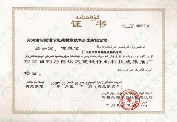 河南南陽銀通節(jié)能建材高技術(shù)開發(fā)有限公司:經(jīng)評定,你單位YT無機(jī)活性墻體保溫隔熱系統(tǒng)項目被列為自治區(qū)建設(shè)行業(yè)科技成果推廣項目。有效期兩年。 新疆維吾爾自治區(qū)建設(shè)廳。