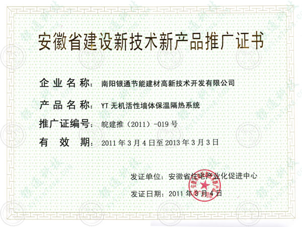 南陽銀通安徽省建設(shè)新技術(shù)新產(chǎn)品推廣證書 企業(yè)名稱:YT無機活性墻體保溫隔熱系統(tǒng) 推廣證編號:皖建推(2011)-019號 有效期:2011年3月4日至2013年3月3日 發(fā)證單位:安徽省住宅產(chǎn)業(yè)化促進中心 發(fā)證日期:2011年3月4日