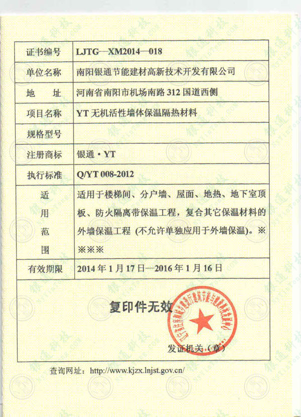 遼寧省工程建設(shè)用產(chǎn)品推廣應(yīng)用證書南陽銀通 證書編號:LJTG-XM2010-126 單位名稱:南陽銀通節(jié)能建材高新技術(shù)開發(fā)有限公司 項目名稱:YT無機活性墻體保溫隔熱材料 注冊商標(biāo):銀通、YT 執(zhí)行標(biāo)準(zhǔn):Q/YT004-2008 適用范圍:適用于民用建筑工程樓梯間、分戶墻的保溫、隔熱、外墻復(fù)合保溫及地?zé)岜毓こ?有效期限:2010年3月15日-2012年4月21日 遼寧省建設(shè)科技發(fā)展促進中心 遼寧省工程建設(shè)用產(chǎn)品推廣應(yīng)用證書南陽銀通 遼寧省工程建設(shè)用產(chǎn)品推廣應(yīng)用證書南陽銀通 證書編號:LJTG-XM2010-126 單位名稱:南陽銀通節(jié)能建材高新技術(shù)開發(fā)有限公司 項目名稱:YT無機活性墻體保溫隔熱材料 注冊商標(biāo):銀通、YT 執(zhí)行標(biāo)準(zhǔn):Q/YT004-2008 適用范圍:適用于民用建筑工程樓梯間、分戶墻的保溫、隔熱、外墻復(fù)合保溫及地?zé)岜毓こ?有效期限:2010年3月15日-2012年4月21日 遼寧省建設(shè)科技發(fā)展促進中心 遼寧省工程建設(shè)用產(chǎn)品推廣應(yīng)用證書南陽銀通 遼寧省工程建設(shè)用產(chǎn)品推廣應(yīng)用證書南陽銀通 證書編號:LJTG-XM2010-126 單位名稱:南陽銀通節(jié)能建材高新技術(shù)開發(fā)有限公司 項目名稱:YT無機活性墻體保溫隔熱材料 注冊商標(biāo):銀通、YT 執(zhí)行標(biāo)準(zhǔn):Q/YT004-2008 適用范圍:適用于民用建筑工程樓梯間、分戶墻的保溫、隔熱、外墻復(fù)合保溫及地?zé)岜毓こ?有效期限:2010年3月15日-2012年4月21日 遼寧省建設(shè)科技發(fā)展促進中心 遼寧省工程建設(shè)用產(chǎn)品推廣應(yīng)用證書南陽銀通
