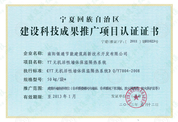寧夏回族自治區(qū)建設(shè)科技成果推廣項(xiàng)目認(rèn)證證書(shū) 寧建(推證)字:【2011】第H1023號(hào) 企業(yè)名稱(chēng):南陽(yáng)銀通節(jié)能建筑高新技術(shù)開(kāi)發(fā)有限公司 項(xiàng)目名稱(chēng):YT無(wú)機(jī)活性墻體保溫隔熱系統(tǒng) 執(zhí)行標(biāo)準(zhǔn):《YT無(wú)機(jī)活性墻體保溫隔熱系統(tǒng)》Q(chēng)/YT004-2008 規(guī)格型號(hào):50kg/袋* 推廣范圍:建筑外墻熱橋部位(非采暖樓梯間內(nèi)墻面、非采暖地下室頂板、防火隔離帶、防火保護(hù)層等) 有效期限:至2013年1月 發(fā)證單位:寧夏回族自治區(qū)住房和城鄉(xiāng)建設(shè)廳 二零一二年元月十二日 寧夏回族自治區(qū)建設(shè)科技成果推廣項(xiàng)目認(rèn)證證書(shū)南陽(yáng)銀通