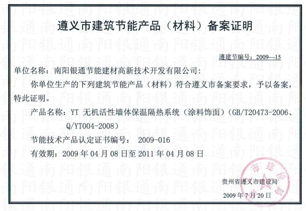 遵義市建筑節(jié)能產(chǎn)品(材料)備案證明