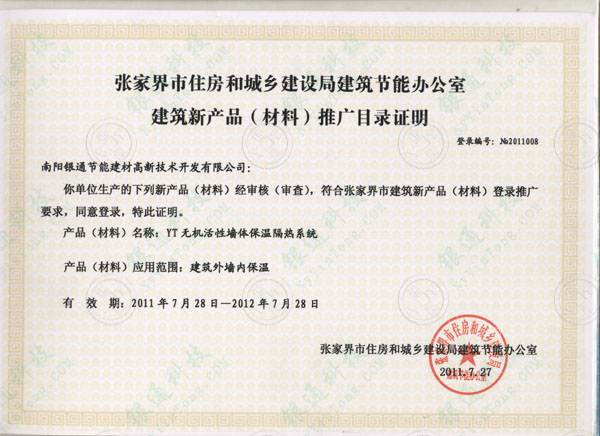 張家界市住房和城鄉(xiāng)建設(shè)局建筑節(jié)能辦公室建筑新產(chǎn)品(材料)推廣目錄證明 登錄編號(hào):No.2011008 南陽(yáng)銀通節(jié)能建材高新技術(shù)開(kāi)發(fā)有限公司:你單位生產(chǎn)的下列新產(chǎn)品(材料)經(jīng)審核(審查),符合張家界市建筑新產(chǎn)品(材料)登錄推廣要求,同意登錄,特此證 明。 產(chǎn)品(材料)名稱(chēng):YT無(wú)機(jī)活性墻體保溫隔熱系統(tǒng) 產(chǎn)品(材料)應(yīng)用范圍:建筑外墻內(nèi)保溫 有效期:2011年7月28日——2012年7月28日 張家界市住房和城鄉(xiāng)建設(shè)局節(jié)能辦公室 2011.7.27