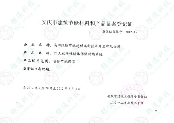 安慶市建筑節(jié)能材料和產(chǎn)品備案登記證 備案證書(shū)編號(hào):2012-15 企業(yè)名稱(chēng):南陽(yáng)銀通節(jié)能建材高新技術(shù)開(kāi)發(fā)有限公司 產(chǎn)品名稱(chēng):YT無(wú)機(jī)活性墻體保溫隔熱系統(tǒng) 產(chǎn)品適用范圍:墻體節(jié)能保溫 備案證書(shū)有效期:自2012年7月20日至2013年3月3日 安慶市建設(shè)工程質(zhì)量監(jiān)督站 二〇一二年七月二十日