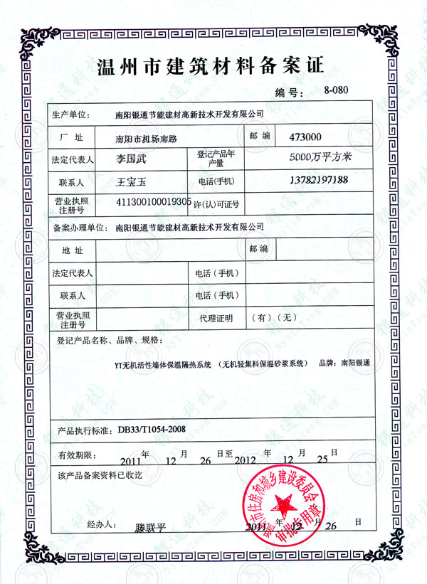 溫州市建筑材料備案證 編號(hào):8-080 生產(chǎn)單位:南陽(yáng)銀通節(jié)能建材高新技術(shù)開發(fā)有限公司 登記產(chǎn)品名稱、品牌、規(guī)格:YT無(wú)機(jī)活性墻體保溫隔熱系統(tǒng)(無(wú)機(jī)輕集料保溫砂漿系統(tǒng)) 品牌:南陽(yáng)銀通 產(chǎn)品執(zhí)行標(biāo)準(zhǔn):DB33/T1054-2008 有效期:2011年12月26日至2012年12月25日 該產(chǎn)品備案資料已收訖 溫州市住房和城鄉(xiāng)建設(shè)委員會(huì) 審批專用章 2011年12月26日