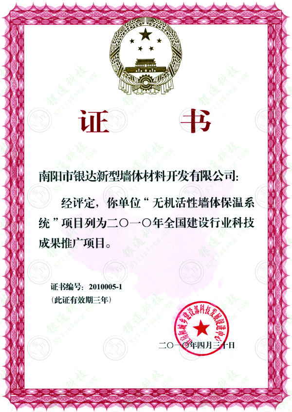 2010全國建設(shè)行業(yè)科技成果推廣項(xiàng)目證書 有效期:三年 。 頒發(fā)時(shí)間 2010年4月30日