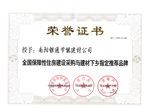 2011年7月17-18日在釣魚臺(tái)國賓館、天壇飯店召開“中國房地產(chǎn)50人論壇2011北京夏季峰會(huì)——產(chǎn)業(yè)轉(zhuǎn)型與融資戰(zhàn)略高層研討會(huì)”上,中國建筑材料流通協(xié)會(huì),中國聯(lián)合商報(bào)社和北京房地產(chǎn)學(xué)會(huì)聯(lián)合發(fā)布,授予南陽銀通節(jié)能建材公司全國保障性住房建設(shè)采購與建材下鄉(xiāng)指定推薦品牌!