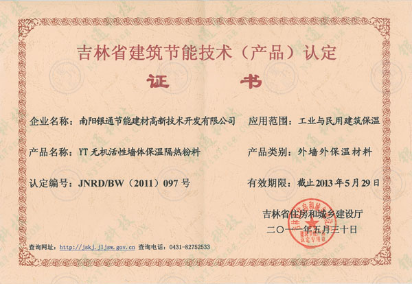 此證書為歷年曾獲證書,本介紹頁(yè)僅為方便用戶了解查詢企業(yè)歷史資質(zhì),望悉知 吉林省建筑節(jié)能技術(shù)產(chǎn)品認(rèn)定 有效期限:截至2013年5月29日