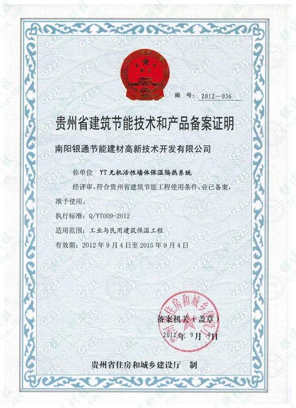 貴州省建筑節(jié)能技術(shù)和產(chǎn)品備案證書 編號:2012—036 南陽銀通節(jié)能建材高新技術(shù)開發(fā)有限公司 你單位YT無機(jī)活性墻體保溫隔熱系統(tǒng) 經(jīng)評審,符合貴州省建筑節(jié)能工程使用條件,業(yè)已備案,準(zhǔn)予使用。 執(zhí)行標(biāo)準(zhǔn):Q/YT009-2012 適用范圍:工業(yè)與民用建筑保溫工程 有效期:2012年9月4日至2015年9月4日 備案機(jī)關(guān)(蓋章):貴州省住房和城鄉(xiāng)建設(shè)廳 2012年9月4日 貴州省住房和城鄉(xiāng)建設(shè)廳 制