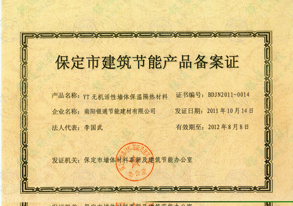 河北保定市建筑節(jié)能產(chǎn)品備案證 產(chǎn)品名稱 YT無(wú)機(jī)活性墻體保溫隔熱材料 證書(shū)編號(hào)BDJN2011-0014 企業(yè)名稱 南陽(yáng)銀通節(jié)能建材有限公司 發(fā)證日期2011年10月14日 有效期至2012年8月8日 發(fā)證機(jī)關(guān) 保定市墻體材料革新及建筑節(jié)能辦公室