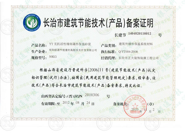 山西長(zhǎng)治市建筑節(jié)能技術(shù)產(chǎn)品備案證明 長(zhǎng)建節(jié) 1404020110012號(hào) 產(chǎn)品名稱yt無機(jī)活性墻體隔熱保溫砂漿 產(chǎn)品類型 建筑外墻外保溫系統(tǒng)材料 生產(chǎn)企業(yè) 南陽銀通節(jié)能建材高薪技術(shù)開發(fā)有限公司 執(zhí)行標(biāo)準(zhǔn) Q/YT2004-2008規(guī)格型號(hào) 50KG 根據(jù)山西省建設(shè)廳晉建科字【2006】11號(hào)建筑節(jié)能技術(shù)產(chǎn)品認(rèn)定標(biāo)識(shí)管理試行方法,按國(guó)家民用建筑節(jié)能管理規(guī)定要求,經(jīng)審查 該技術(shù)產(chǎn)品符合長(zhǎng)治市建筑節(jié)能技術(shù)產(chǎn)品備案要求 特發(fā)此證 山西省認(rèn)定編號(hào) 晉JZJN2010306號(hào) 有效期限至2012年08月24日 備案機(jī)關(guān) 長(zhǎng)治市建筑節(jié)能產(chǎn)品管理中心