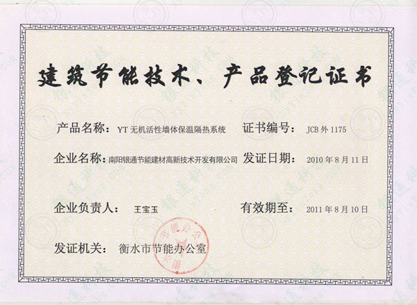 河北衡水市建筑節(jié)能技術(shù)產(chǎn)品登記證書 產(chǎn)品名稱 YT無(wú)機(jī)活性墻體保溫隔熱系統(tǒng) 證書編號(hào)JCB外1175 企業(yè)名稱南陽(yáng)銀通節(jié)能建材高新技術(shù)開發(fā)有限公司發(fā)證日期2010年8月11日有效期至2011年8月10日發(fā)證機(jī)關(guān)衡水市節(jié)能辦公室