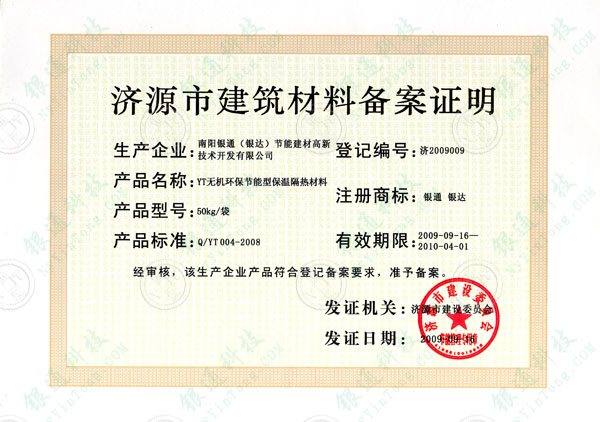 河南省濟源市建筑材料備案證明 備案編號濟2009009 企業(yè)名稱南陽銀通節(jié)能建材高新技術(shù)開發(fā)有限公司 南陽市銀達新型墻體材料開發(fā)有限公司 產(chǎn)品名稱YT無機環(huán)保節(jié)能型墻體保溫材料 規(guī)格型號YT-A 產(chǎn)品型號50kg/袋注冊商標(biāo)銀通 銀達 產(chǎn)品標(biāo)準(zhǔn)Q/YT004-2008 有效期限2009年9月16日至2010年4月1日 經(jīng)審核,該生產(chǎn)企業(yè)產(chǎn)品符合登記備案要求 準(zhǔn)予備案 發(fā)證機關(guān)濟源市建設(shè)委員會 濟源市建設(shè)委員會節(jié)能管理專用章