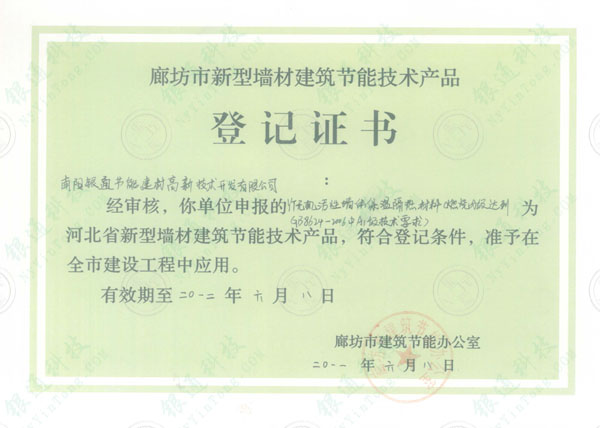 河北廊坊市新型墻材建筑節(jié)能技術(shù)產(chǎn)品登記證書 南陽銀通節(jié)能建材高新技術(shù)開發(fā)有限公司 南陽市銀達新型墻體材料開發(fā)有限公司 經(jīng)審查 你單位申報的YT無機活性墻體保溫材料燃燒等級達到GB8624-2006中A1級技術(shù)要求為河北省新型墻材建筑節(jié)能技術(shù)產(chǎn)品 符合登記條件 準許在全市建筑工程中使用 有效期至2012年6月8日廊坊 2011年6月8日