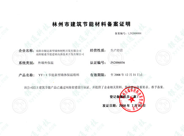 河南省林州市建筑節(jié)能材料備案證明 備案編號(hào)LJN2008004 企業(yè)名稱南陽(yáng)銀通節(jié)能建材高新技術(shù)開(kāi)發(fā)有限公司 南陽(yáng)市銀達(dá)新型墻體材料開(kāi)發(fā)有限公司 產(chǎn)品名稱YT-1節(jié)能新型墻體保溫粉料YT無(wú)機(jī)活性墻體保溫隔熱系統(tǒng) 系統(tǒng)類別外墻外保溫 規(guī)格型號(hào)YT-A 產(chǎn)品型號(hào)50kg/袋注冊(cè)商標(biāo)銀通 銀達(dá) 有效期限2008年12月31日 該公司以上建筑節(jié)能產(chǎn)品已通過(guò)河南省建設(shè)廳認(rèn)證 并提供了企業(yè)相關(guān)資料 符合登記備案要求 準(zhǔn)予備案 登記備案機(jī)關(guān) 林州市墻體材料改革管理辦公室 發(fā)證日期2008年7月23日