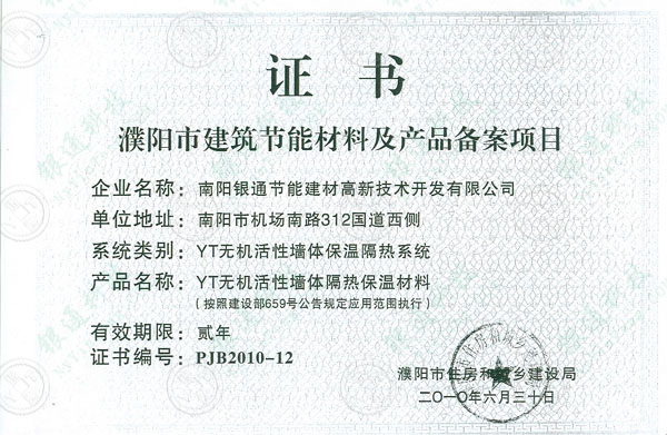 河南省濮陽(yáng)市建筑節(jié)能材料及產(chǎn)品備案證書 企業(yè)名稱 南陽(yáng)市銀達(dá)新型墻體材料開(kāi)發(fā)有限公司 單位地址 南陽(yáng)市機(jī)場(chǎng)南路312國(guó)道西側(cè) 產(chǎn)品名稱YT無(wú)機(jī)活性墻體保溫隔熱系統(tǒng) 系統(tǒng)類別無(wú)機(jī)活性墻體保溫隔熱系統(tǒng) 證書編號(hào)PJB2010-12 有效期限二年 規(guī)格型號(hào)YT-A 產(chǎn)品型號(hào)50kg/袋 注冊(cè)商標(biāo)銀通 銀達(dá) 登記備案機(jī)關(guān) 濮陽(yáng)市住房和城鄉(xiāng)建設(shè)局 發(fā)證日期2010年6月30日