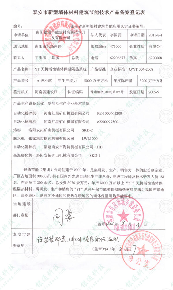 山東泰安市新型墻體材料建筑節(jié)能技術(shù)產(chǎn)品備案登記證 山東省新型墻材建筑節(jié)能應用認定證書 南陽銀通節(jié)能建材高新技術(shù)開發(fā)有限公司 你單位生產(chǎn)的yt無機活性墻體保溫隔熱系統(tǒng) 已經(jīng)取得山東省新型墻材建筑節(jié)能技術(shù)產(chǎn)品認定證書 同意在我市建設(shè)工程保溫漿料中應用 當?shù)亟ㄔO(shè)部門意見 南陽市住房和城鄉(xiāng)建設(shè)委員會科技與建筑節(jié)能科 同意推廣應用 泰安市建委意見 保溫漿料類 外墻屋面保溫用 泰安市墻體材料革新與建筑節(jié)能工作領(lǐng)導小組辦公室 2011年8月17日