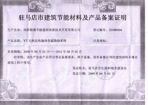 河南省駐馬店市建筑節(jié)能材料及產(chǎn)品備案證書 企業(yè)名稱 南陽市銀達新型墻體材料開發(fā)有限公司南陽銀通節(jié)能建材高新技術開發(fā)有限公司 單位地址 南陽市機場南路312國道西側 產(chǎn)品名稱YT無機活性墻體保溫隔熱系統(tǒng) 系統(tǒng)類別無機活性墻體保溫隔熱系統(tǒng) 證書編號20080004 有效期限至2011年4月1日 注冊商標銀通 銀達 經(jīng)審核,該生產(chǎn)企業(yè)產(chǎn)品符合登記備案要求 準予備案沒有備案證明的建筑材料不準在建筑工程中使用 發(fā)證機關駐馬店市住房和城鄉(xiāng)建設廳 發(fā)證日期2009年4月1日