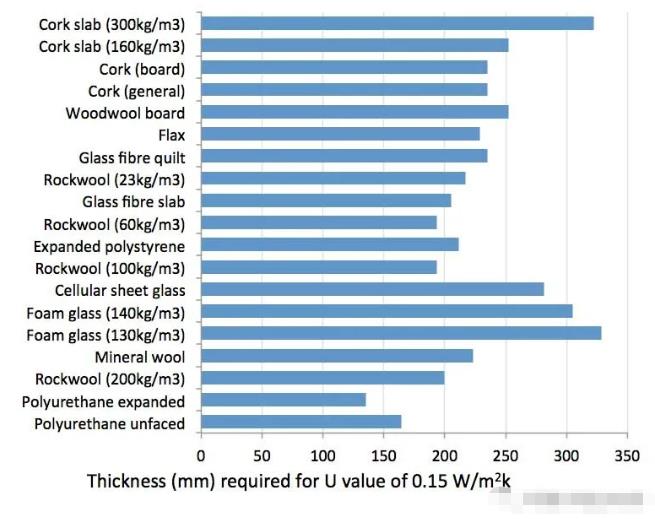 不同保溫材料在同等保溫傳熱系數(shù)目標(biāo)下的厚度對(duì)比