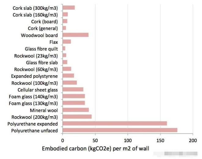 上面的表圖,但從厚度角度,肯定是厚度越厚,體積越大。我們下面來對(duì)比材料的隱含碳排放。隱含碳是指任何一種產(chǎn)品的生產(chǎn),都會(huì)直接或間接地產(chǎn)生碳排放,為了得到某種產(chǎn)品,而在整個(gè)生產(chǎn)鏈中所排放的二氧化碳。那么,越是那些化工產(chǎn)品,可能經(jīng)過了很多工藝,引起的隱含碳就越高。越是依靠天然材料就能加工制作的材料,其隱含碳就越少。下面這個(gè)就是各種保溫材料的隱含碳對(duì)比