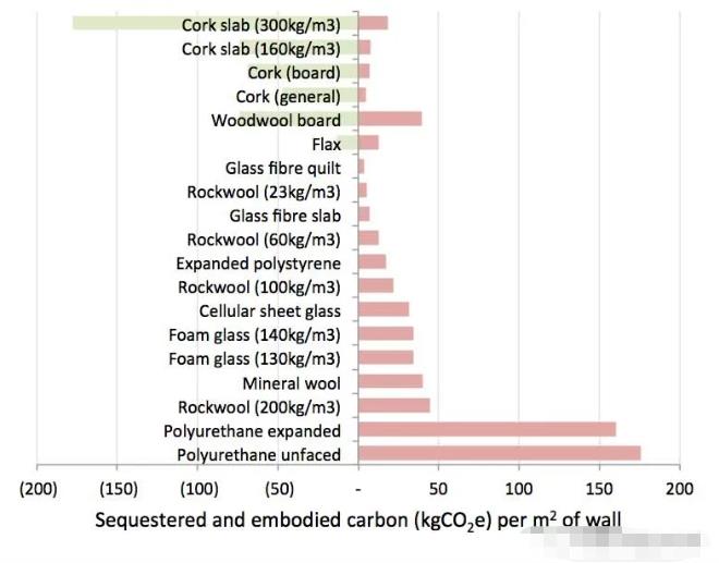 最后的結(jié)果還是表明,化學(xué)建材保溫材料,巖棉、礦棉這類材料的碳排放還是居高的。而軟木保溫材料卻成了最低碳的保溫材料。