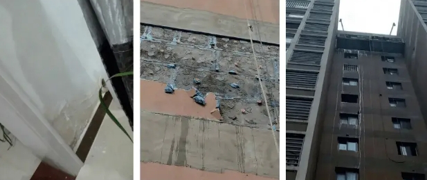 江蘇某項目,共3棟31層高層住宅和2棟3層別墅,外墻采用聚氨酯復合保溫板外墻外保溫系統(tǒng),涂料飾面。該項目外保 溫構(gòu)造如下:基層(含界面劑處理)+砂漿找平層+黏結(jié)砂漿+聚氨 酯復合保溫板+抗裂砂漿(壓入耐堿玻纖網(wǎng)格布)+外墻膩子+涂 料飾面。小區(qū)投入使用后陸續(xù)發(fā)現(xiàn)局部外飾面位置出現(xiàn)裂縫、起鼓脫殼情況,隨后開裂情況加劇,出現(xiàn)滲漏,局部出現(xiàn)脫落的情況。