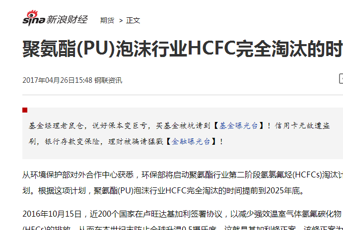 從環(huán)境保護(hù)部對(duì)外合作中心獲悉,環(huán)保部將啟動(dòng)聚氨酯行業(yè)第二階段氫氯氟烴(HCFCs)淘汰計(jì)劃。根據(jù)這項(xiàng)計(jì)劃,聚氨酯(PU)泡沫行業(yè)HCFC完全淘汰的時(shí)間提前到2025年底。