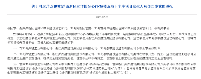 據(jù)記者了解,這已經(jīng)不是遠(yuǎn)洋萬(wàn)和城第一次發(fā)生事故,2020年7月25日,青島市住房和城鄉(xiāng)建設(shè)局發(fā)布了一起事故通報(bào):遠(yuǎn)洋萬(wàn)和城(浮山新區(qū)遠(yuǎn)洋國(guó)際中心)1-3#樓及地下車庫(kù)項(xiàng)目發(fā)生一起電梯井內(nèi)高處墜落事故,導(dǎo)致1人死亡。