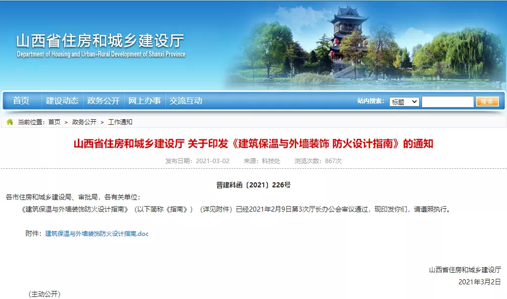 為預(yù)防建筑保溫與外墻裝飾引發(fā)火災(zāi)、保護(hù)人身和財產(chǎn)安全,山西省住房和城鄉(xiāng)建設(shè)廳近日印發(fā)《建筑保溫與外墻裝飾防火設(shè)計指南》。指南自4月1日起施行。