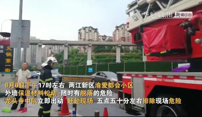 兩江新區(qū)火鍋一條街中渝愛都會小區(qū)外墻保溫材料松動。