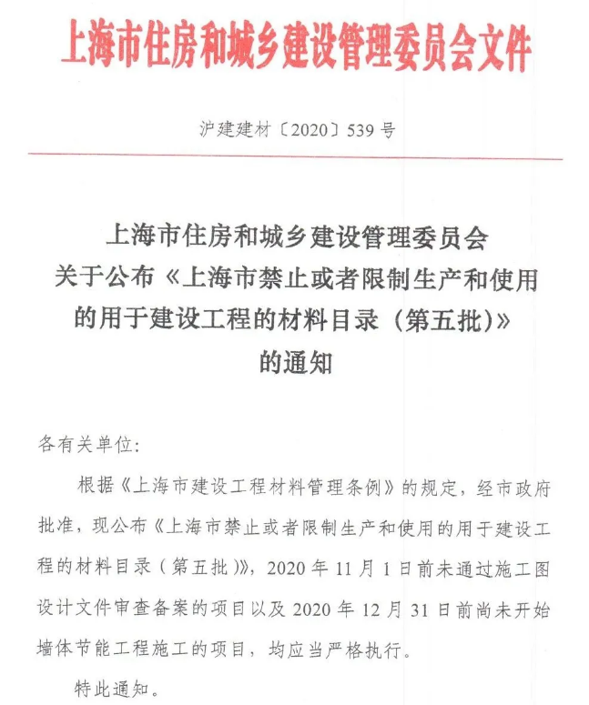 根據(jù)《上海市建設(shè)工程材料管理條例》的規(guī)定,經(jīng)市政府批準(zhǔn),現(xiàn)公布《上海市禁止或者限制生產(chǎn)和使用的用于建設(shè)工程的材料目錄(第五批)》,2020年11月1日前未通過施工圖設(shè)計文件審查備案的項目以及2020年12月31日前尚未開始墻體節(jié)能工程施工的項目,均應(yīng)當(dāng)嚴格執(zhí)行。