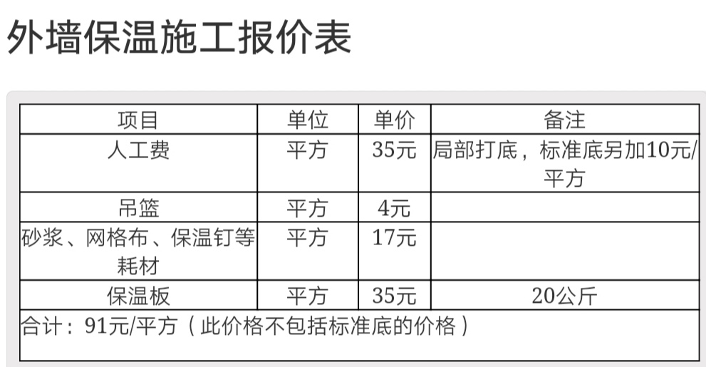 外墻保溫的人工費(fèi)用價(jià)格不定,平均在每平方米35元左右,但根據(jù)使用材料,使用地區(qū)以及后續(xù)工程的差別,價(jià)格會(huì)上下浮動(dòng),外墻保溫人工報(bào)價(jià)表如下: