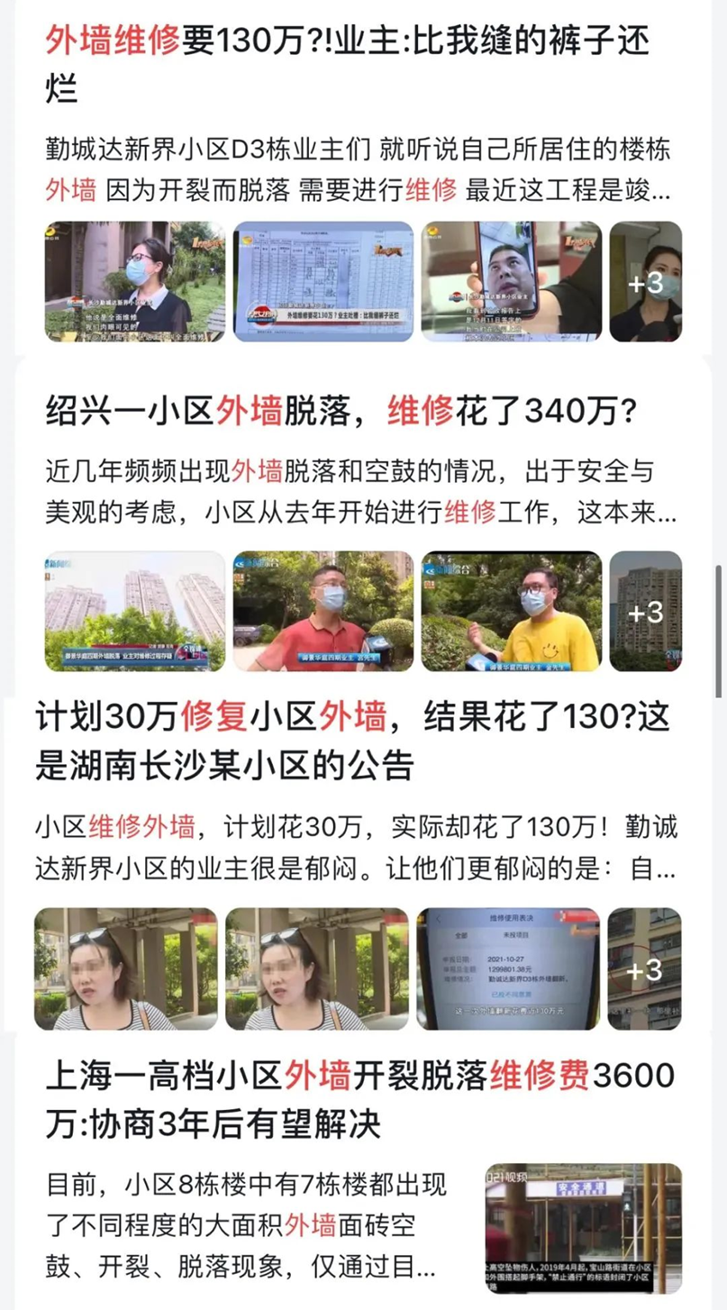 梳理近年被爆出的關(guān)于住宅維修的民生新聞可以看出,目前我國(guó)大部分的住宅后期維修費(fèi)都貴得讓業(yè)主們難以接受。比如,長(zhǎng)沙某小區(qū)樓體維修需花835萬;紹興某小區(qū)外墻空鼓維修花了340萬;南寧某小區(qū)外墻維修費(fèi)用開出2979萬高價(jià);就連幾塊瓷磚脫落,廣西某小區(qū)也開出了6500元的維修費(fèi)........