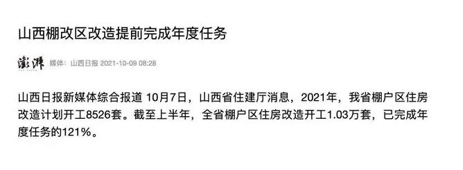 再者,從各地公布的2021年棚改開(kāi)工、完工情況來(lái)看,各地仍然在如火如荼地進(jìn)行棚改拆遷。比如石家莊,年初制定的棚改任務(wù)是:新開(kāi)工5987套、基本建成11618套。截止到目前,石家莊棚改工作已開(kāi)工5989套,基本建成12141套,分別完成年度任務(wù)的100.03%和104.5%。再比如貴州省,12月24日下午,記者從新聞發(fā)布會(huì)上了解到,2021年至2023年全省將完成棚戶區(qū)改造41萬(wàn)套。其中,2021年以來(lái),貴州省已完成棚戶區(qū)改造約9萬(wàn)戶;