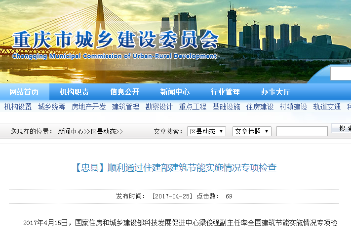 檢查組親臨3個工程項目施工現(xiàn)場對建筑節(jié)能設(shè)計、施工資料和實體節(jié)能工程質(zhì)量進行了全面細致的檢查。一致認為忠縣貫徹落實節(jié)約能源法、《民用建筑節(jié)能條例》及制定有關(guān)配套政策情況好,建筑節(jié)能重點工作完成情況,包括新建建筑執(zhí)行建筑節(jié)能強制性標準等工作推進情況好。