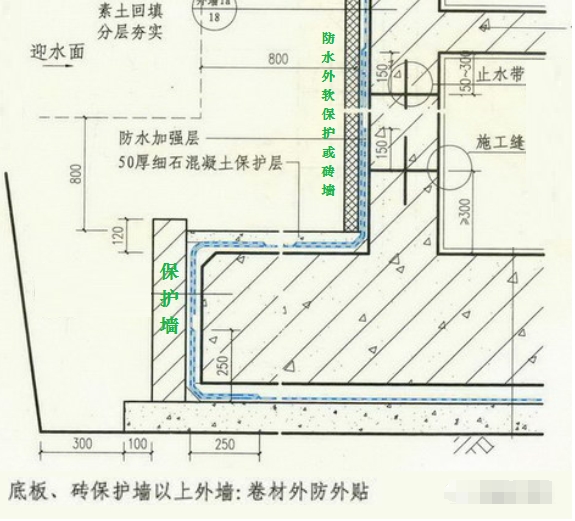 ↘↘基礎(chǔ)外挑部分側(cè)邊砌筑保護(hù)墻,卷材防水采用外防內(nèi)貼法;基礎(chǔ)以上砌體采用外防外貼法,如下圖所示。
